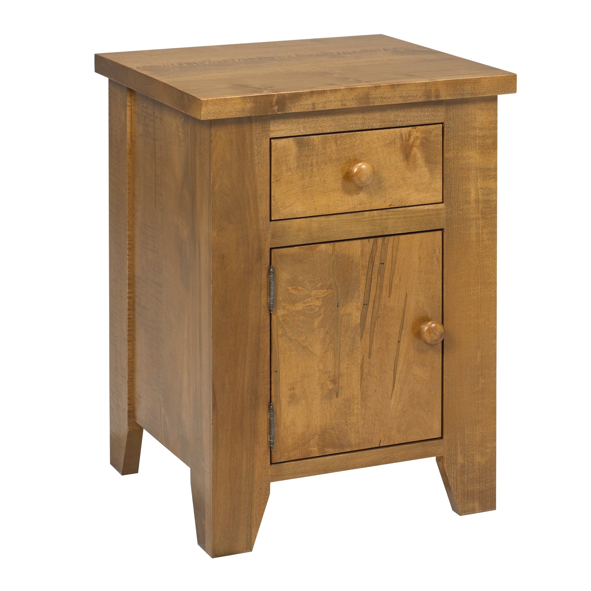 Handcrafted nightstand featuring a simple, rustic aesthetic with solid wood construction. One spacious drawer and single door cabinet provide practical storage for bedside essentials. Equipped with premium Blum soft-close hardware for smooth, whisper-quiet operation. Finished with water-based stain and water-based polyurethane top coat for durability and a natural wood appearance. Compact 20" width fits seamlessly into any bedroom layout while maintaining timeless appeal.