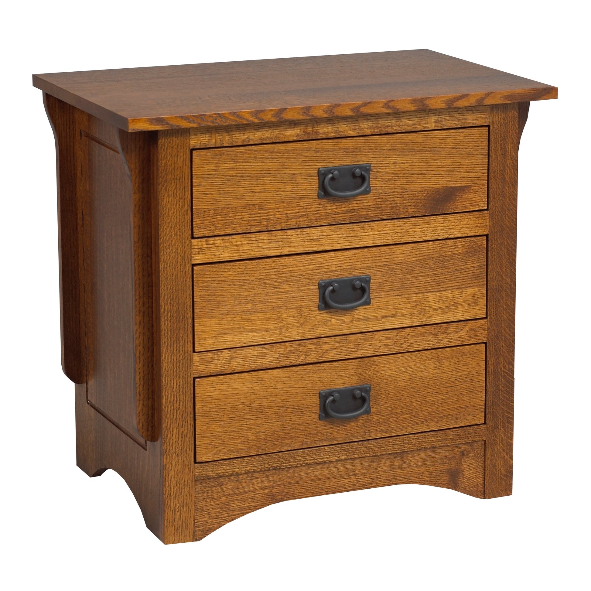 This Mission-style nightstand brings timeless elegance to your bedroom with its clean lines and decorative corbel accents. Three spacious drawers provide ample storage for bedside essentials, while Blum soft-close hardware ensures smooth, whisper-quiet operation. Crafted with water-based stain and finished with a durable water-based polyurethane top coat, it combines solid wood craftsmanship with environmentally conscious finishing.