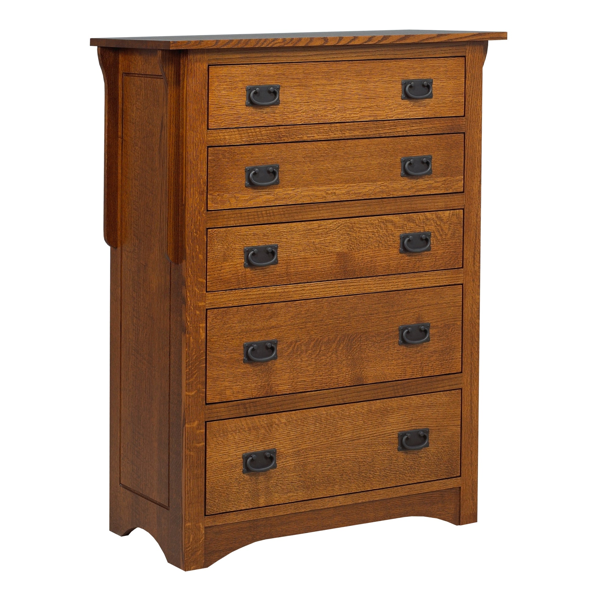 This Mission 5 Drawer Chest combines timeless design with refined craftsmanship. Corbel accents add architectural detail to the piece, while five spacious drawers provide ample storage for any bedroom. Blum soft-close hardware ensures smooth, whisper-quiet operation with every use. Finished with water-based stain and a protective water-based polyurethane top coat, this chest delivers durability and a clean aesthetic that complements any décor.