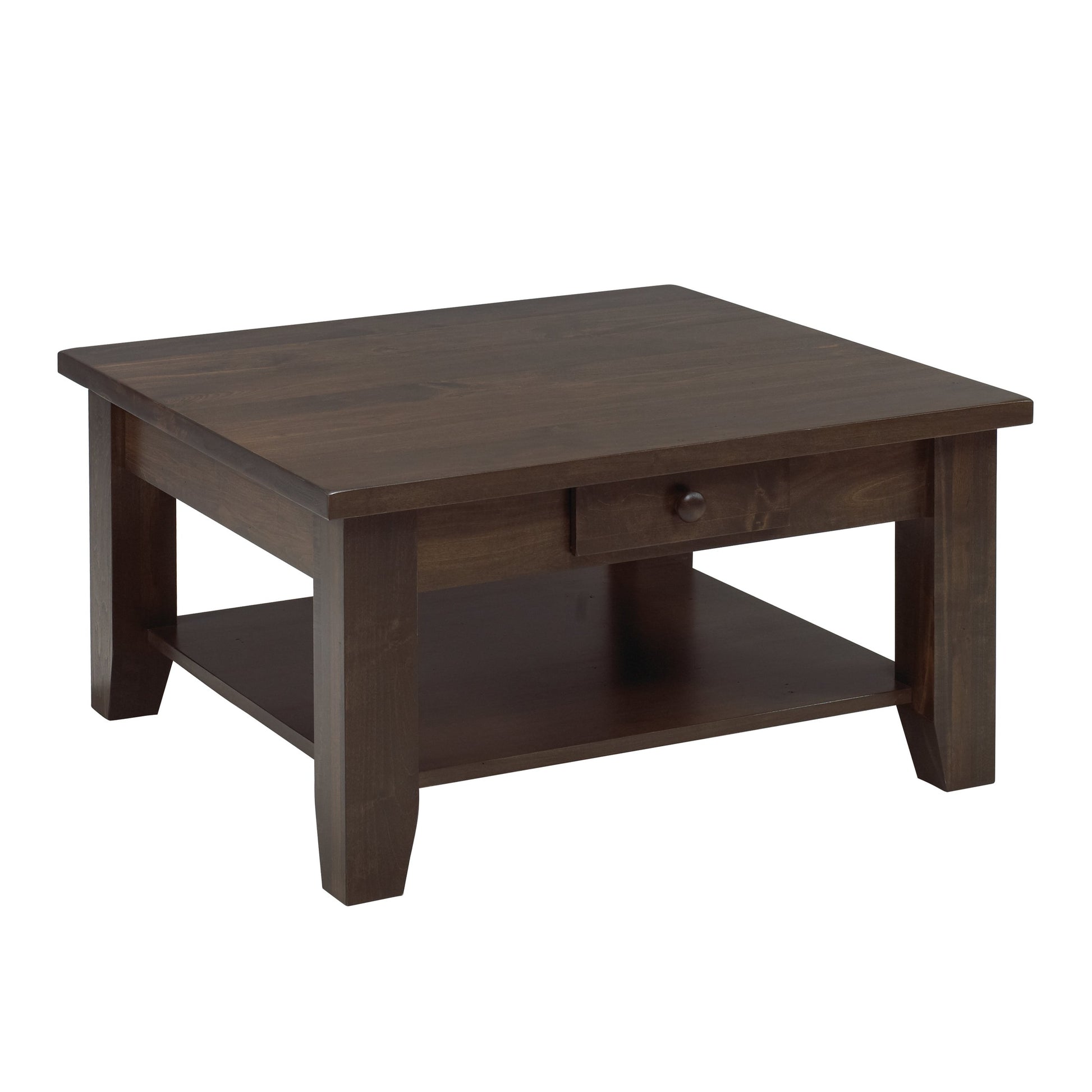 Rustic coffee table featuring simple, clean lines and solid wood construction. Two spacious drawers with Blum soft-close hardware glide smoothly and quietly, while a lower shelf provides additional storage for books, blankets, or décor. Finished with water-based stain and polyurethane top coat for durability and a natural wood appearance. A versatile piece that complements farmhouse, cottage, or contemporary interiors.
