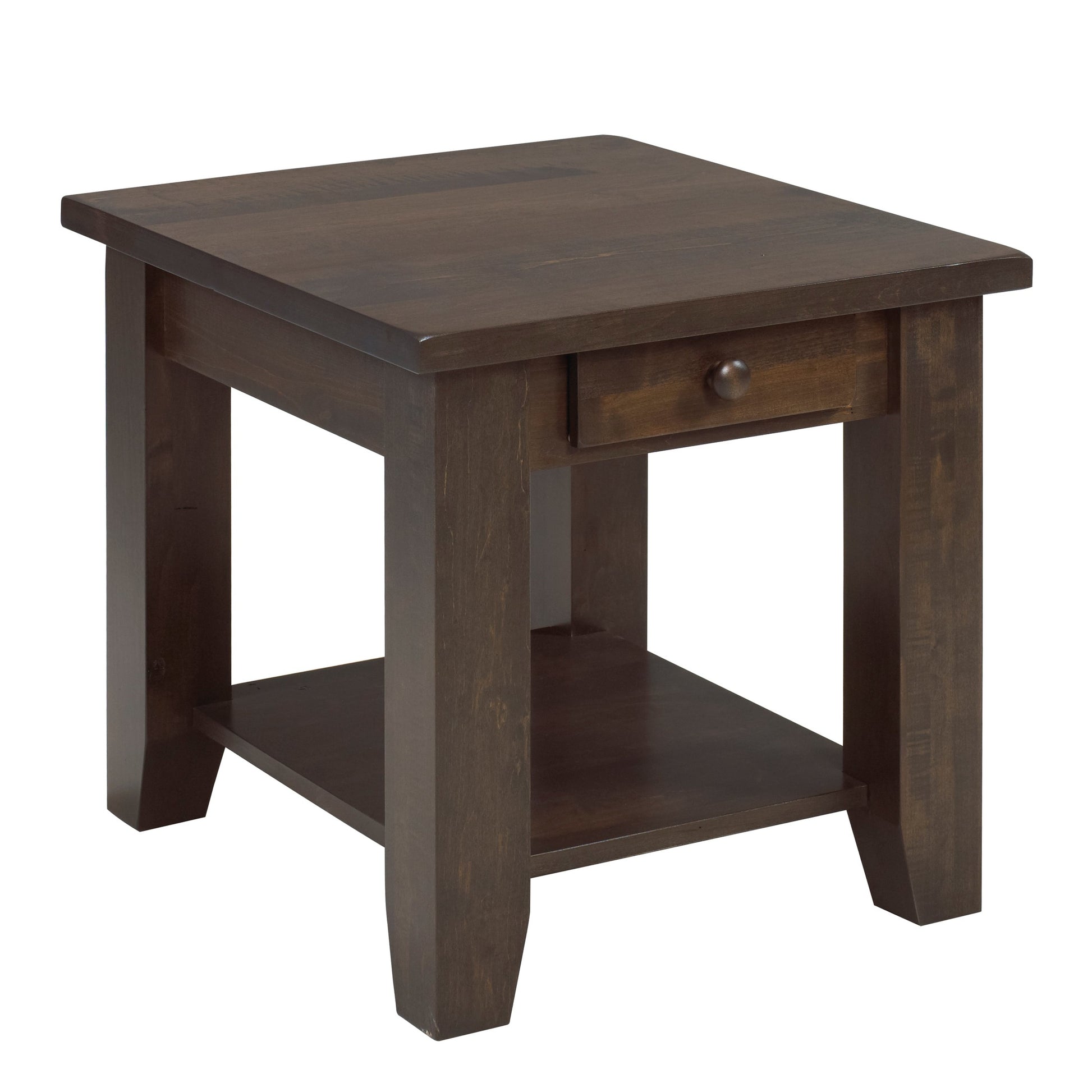 Rustic charm meets functional design in this solid wood end table. A single drawer with Blum soft-close hardware glides smoothly, while the lower shelf provides additional storage for books, blankets, or décor. Finished with water-based stain and polyurethane top coat for durability and a natural wood appearance. Perfect beside a sofa or bed.